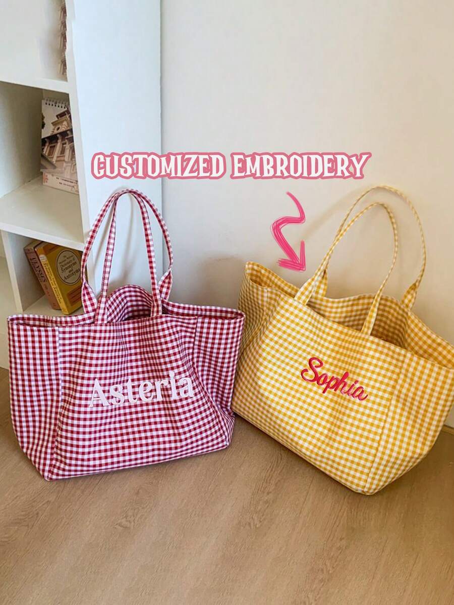 • (Customized) Personalized Embroidered Minimalist Plaid Canvas Tote Bag, Original Niche Versatile Commuter Large Capacity Shoulder Bag For Students