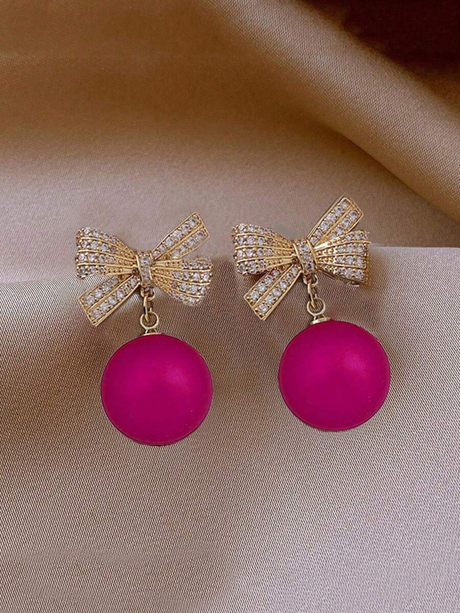 1 Pair Fashion Metal Bow Pearl Dangle Earrings, Pink Suitable For Women, Christmas, New Year Party Valentines,Mom,Mother,Mother's Day,Gift