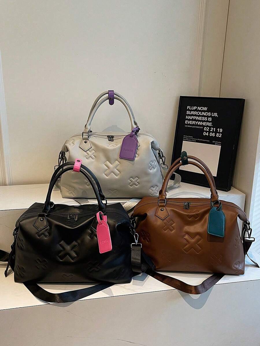 1 Pc Fashionable And Cool Multifunctional Large Capacity Solid Color PU Leather Embossed Soft And Thick Padded Travel Bag With Contrasting Color Boarding Pass Pendant Design Suitable For Both Men And Women For Leisure Vacation&Business Trip And Returning To School
