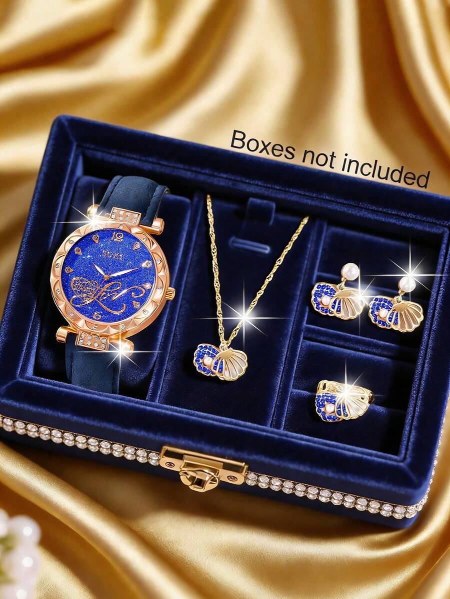 1 Set Fashionable & Fresh Shell Hollow Pendant Necklace, Earrings And Ring Jewelry Set, Paired With 1 Women Quartz Watch With Heart-Shaped Dial And Crystal-Embellished Case, Suitable For Daily Wear, Birthday Gift, Party, Holiday Gathering, Ideal Gift For Yourself Or Friends. No Gift Box Included.