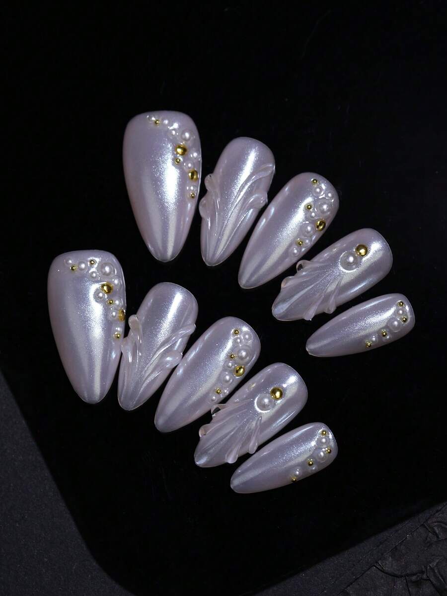 10pcs Almond Moonlight White 100% Handmade 3D Wavy French Minimalist Nail Stickers, Reusable, Suitable For All Seasons, Nail & Eyelash