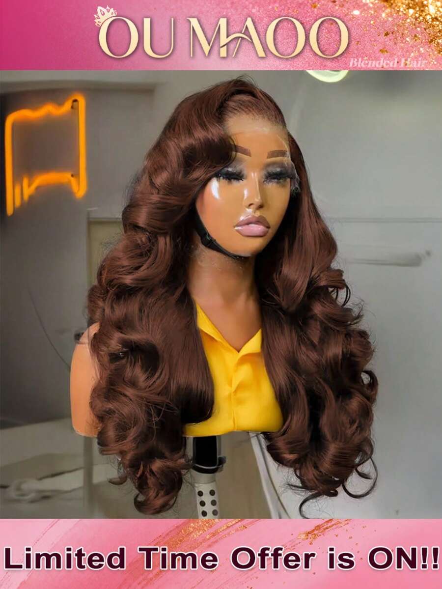 • 13x4 HD Lace Front Wig Human Blended Hair Body Wave 34 Inch - 200% High Density Pre-Plucked Glueless Frontal Wig For Women, Natural Look & Feel, No Glue Easy Install, Ready To Wear Daily & Special Occasion Versatile Styling Wig - Brown - View 9
