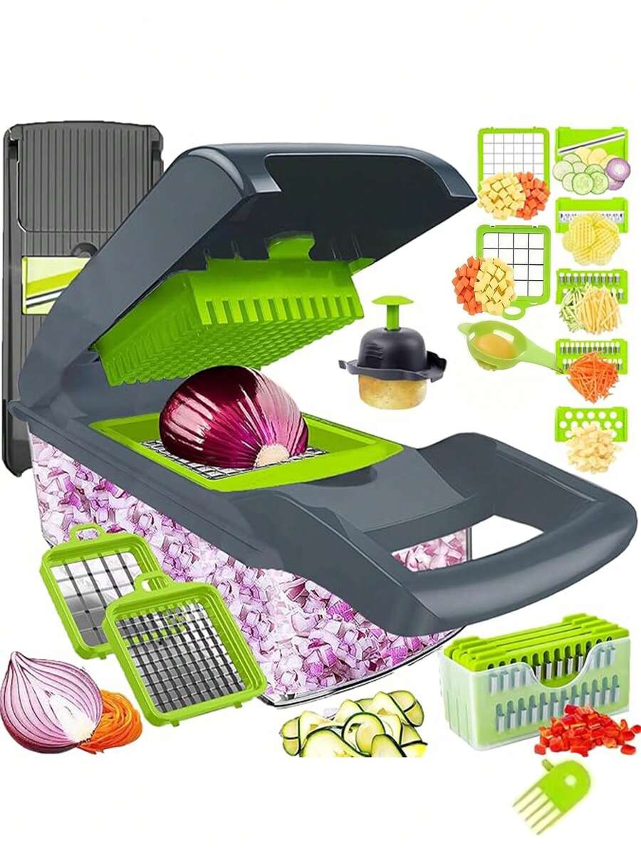16pcs Vegetable Chopper, Multi-Functional Kitchen Vegetable Chopper, Easy To Make Salad, Interchangeable Blades, Party/Kitchen Tool, Manual Food Grater, With Container, Onion Chopper, Potato Chopper, Kitchen Gadget