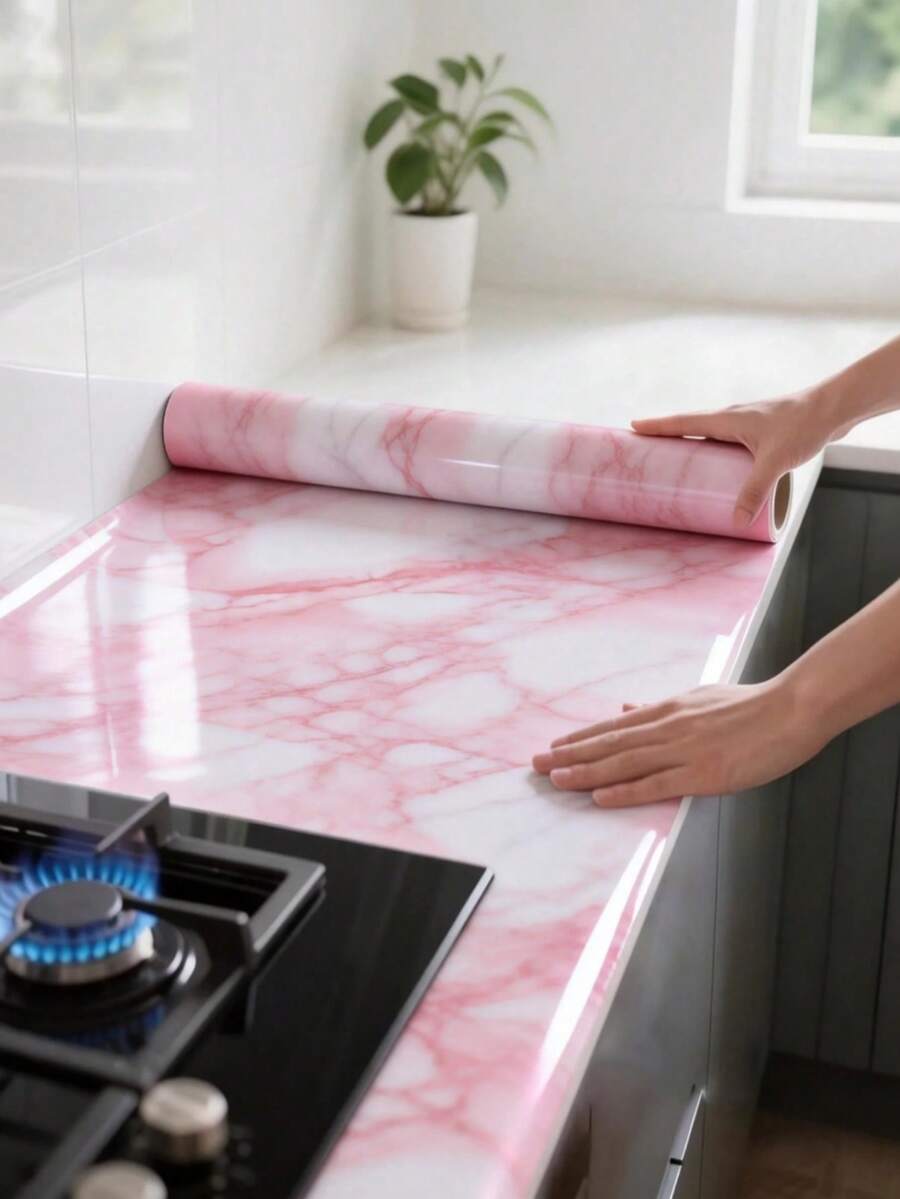 1Roll Pink Marble Contact Paper Glossy Wallpaper Stick And Peel Self Adhesive Removable Waterproof Wall Covering For Table Countertop Cabinet Drawer Cabinet Sticker
