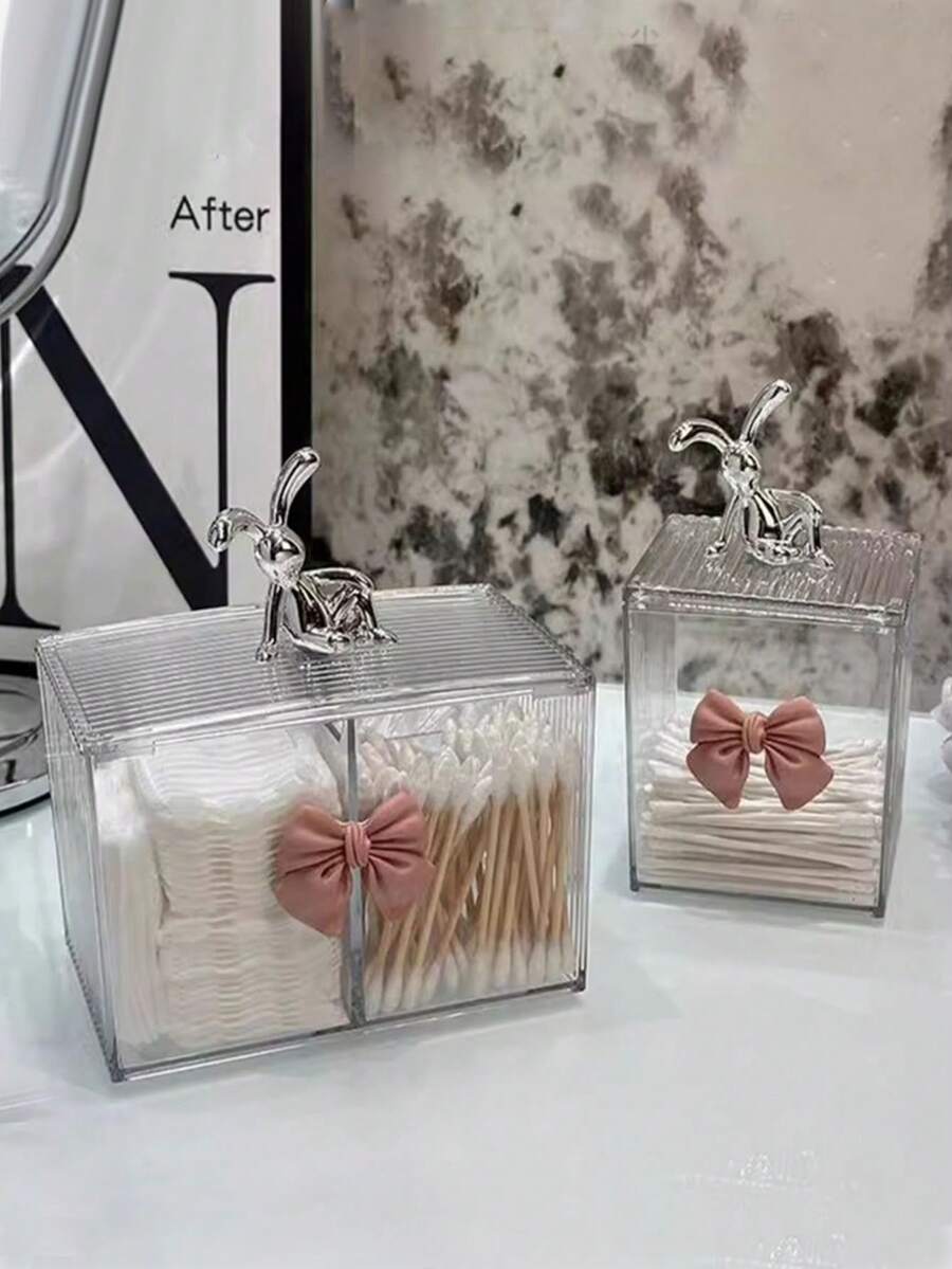 • 1pc Cotton Swab Storage Box, Desktop Covered Dust-Proof Makeup Pad Pad Organizer, Bathroom Cotton Bud Holder With Cute Pink Bow - Multicolor - View 10