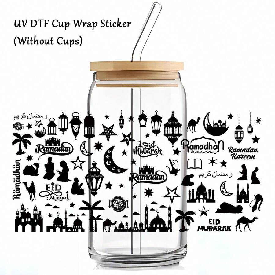 1pc Eid Mubarak UV DTF Transfer Sticker - Castle Lantern Star & Moon Pattern Ramadan Kareem Cup Wraps Decal For Mugs, Glassware, Bottles & Art Crafts, Self-Adhesive Crystal Labels