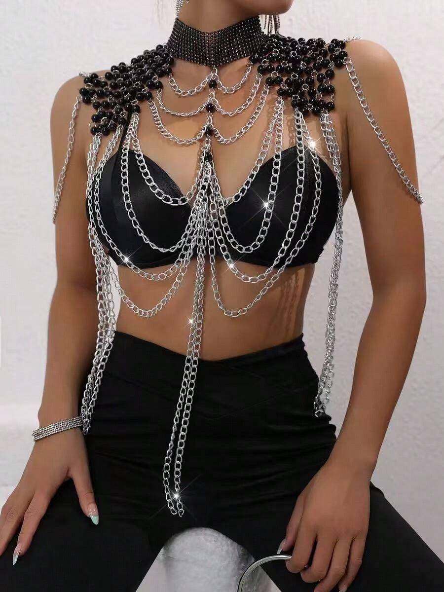 1pc Gothic Style Sexy Black Spaghetti Strap Metal Tassel Chain Body Chain, Luxury Shoulder Chain, Fashion Queen Party Outfit