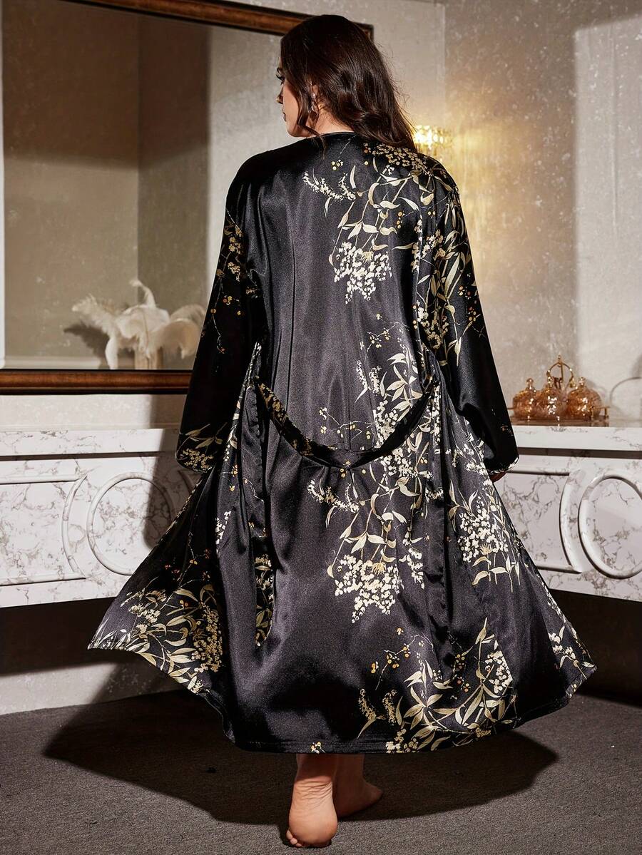 • 1pc Plus Size Women Floral Print Satin Robe, V-Neck Long Sleeve Loose Bathrobe, Kimono Style Tie Waist Long Loungewear, Smooth Silk-Like Fabric, Machine Washable, Suitable For Home Use - Black - View 3