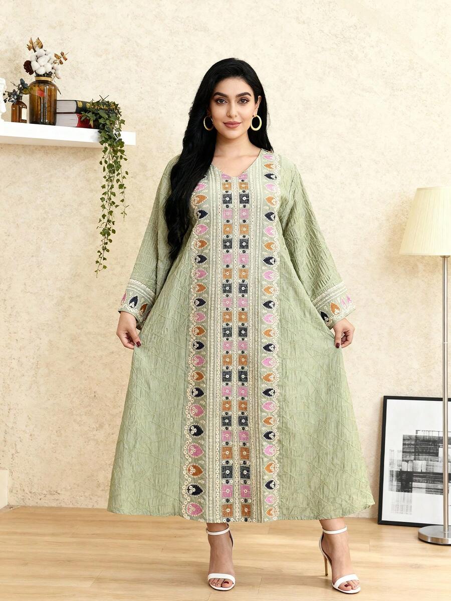 • 2026 New Style Ramadan Traditional Elegant Embroidered V-Neck Long Sleeve Dress For Women - Green - View 2
