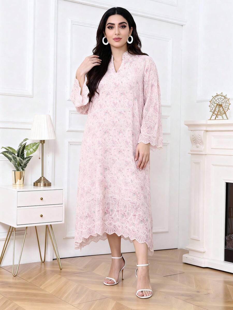 2026 New Style Ramadan Traditional Elegant Floral Embroidered Asymmetrical Ruffle Hem Dress, Modest Arabic Women Clothing