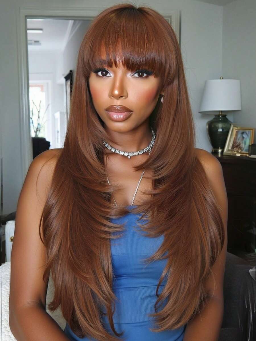 24-Inch Layered Straight Wig With Bangs For Women, Glueless, Realistic Synthetic Material, Heat Resistant, Natural Layered Look, Suitable For Daily Wear, Parties, Cosplay And More
