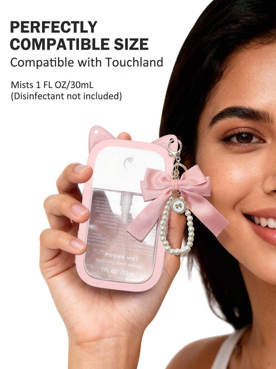 2pcs 1oz (30ml) Hand Sanitizer Spray Bottle Covers, Bow Pearl Keychain And Cute Purple Cat Ear Silicone Anti-Drop Anti-Shock Protective Cases, Travel Perfume Mini Packaging Protective Covers, Anti-Damage
