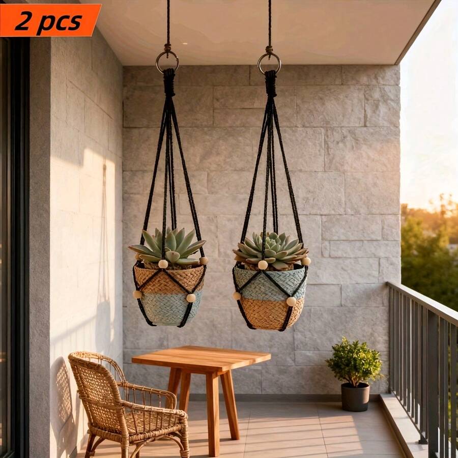 2pcs Adjustable Iron Ring & Wooden Bead Boho Style Handmade Woven Plant Hanging Rope, Indoor Flower Pot Holder Macrame Plant Hanger