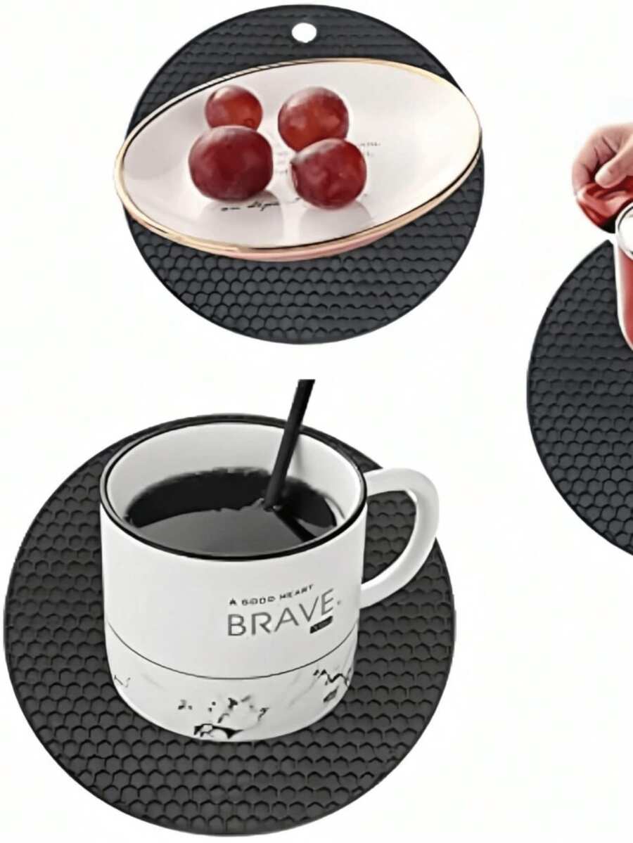 2pcs/Set Silicone Insulation Pad, Modern Black Honeycomb Textured Round Anti-Slip Hot Pot Mat For Table
