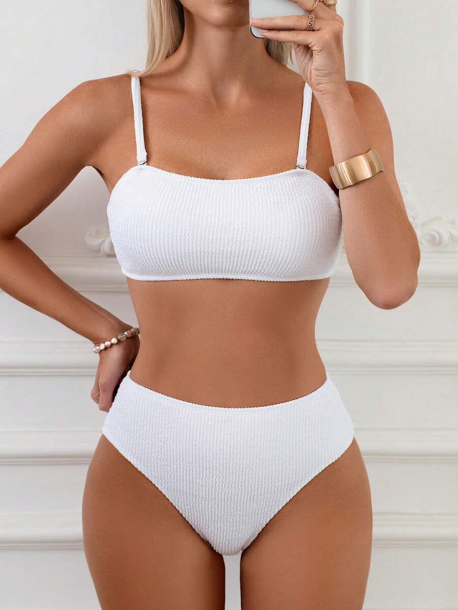 2pcs Women Graduation/Independence Day Ribbed White Fashionable Bikini Set