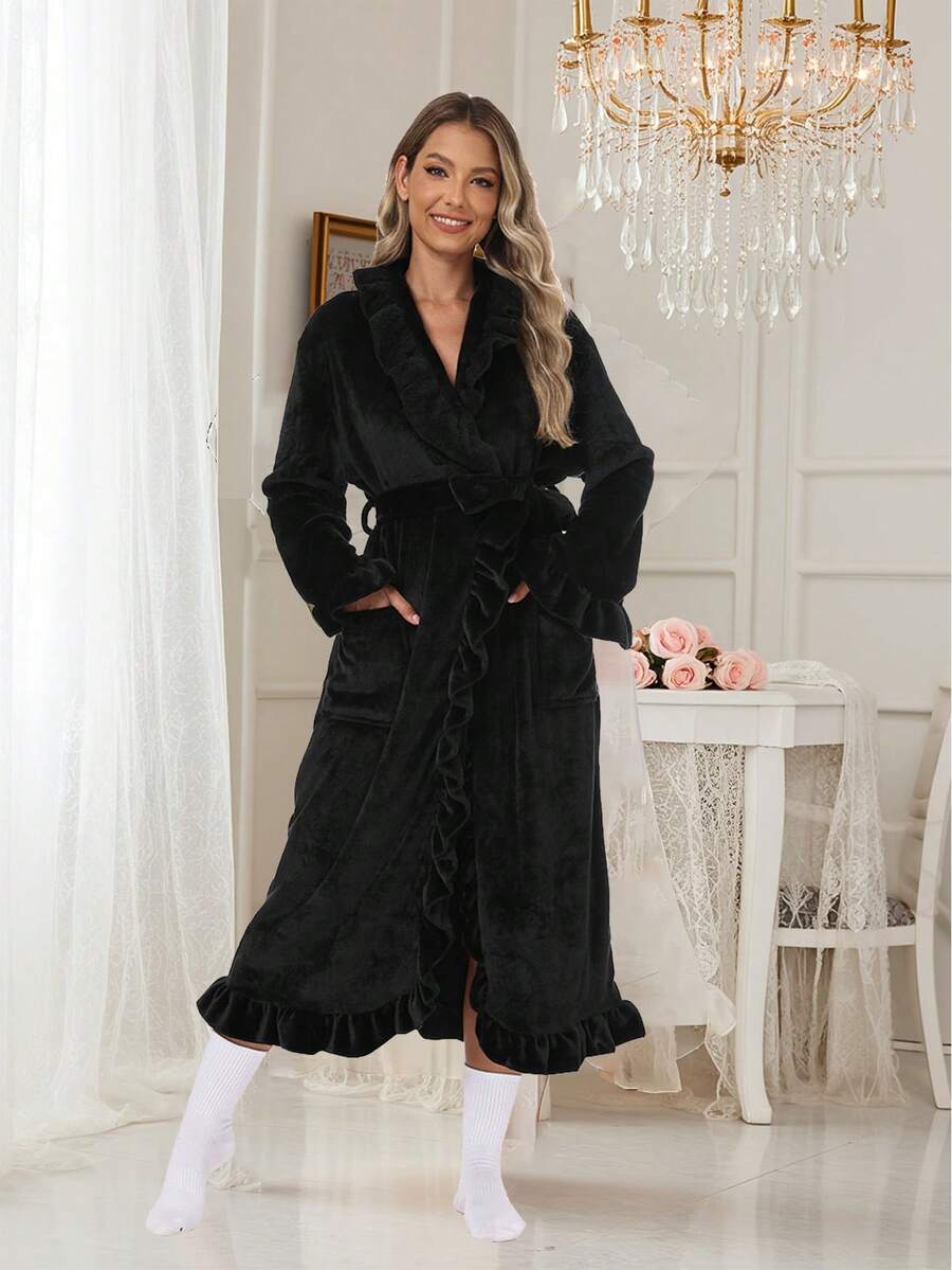 2pcs Women's Super Soft Ruffle Hem Thick Fleece Robe, Ruffle Hem Fashion Robe With Side Pockets, Warm Long Bathrobe, Plush SPA Robe, Loungewear, Sleepwear