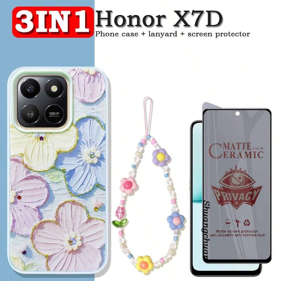 • 3in1 For Honor X7D Ceramic Film, Matte, Privacy Soft Film, Honor X7D Rhinestone, Resin, Phone Case, Colorful Painting, Double Layer, Jelly Case, Flower, Beaded, Phone Lanyard - 3IN1 (Privacy Soft Film) - View 3