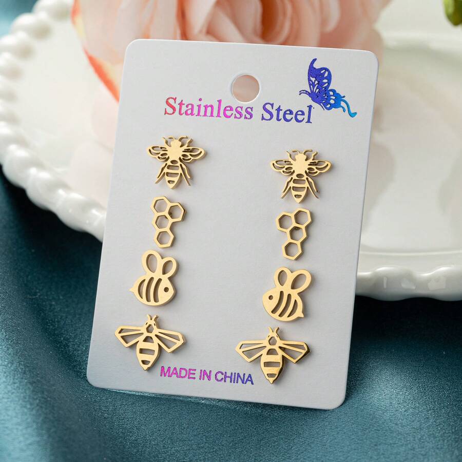 4 Pairs /Sets , Stainless Steel Bee-Shaped Pattern Earrings, Cute And Simple Animal Designs, Suitable As Gifts For Daily Wear