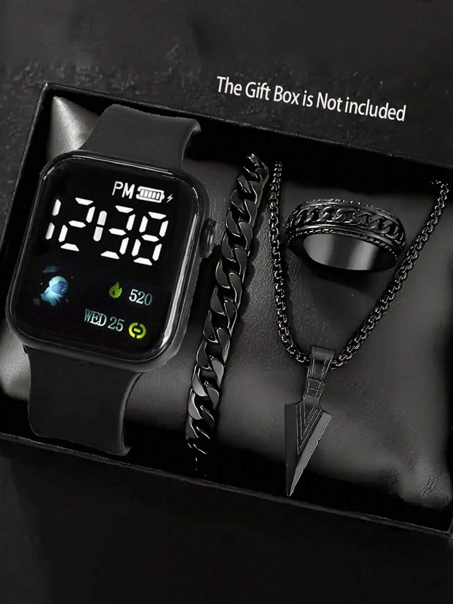 4pcs Fashion Minimalist Digital Display Electronic Watch Set With Black Pendant Necklace Bracelet Ring Jewelry Suit, Suitable For Daily Life, Travel, Vacation, Back To School, Party, Graduation Gift, No Gift Box