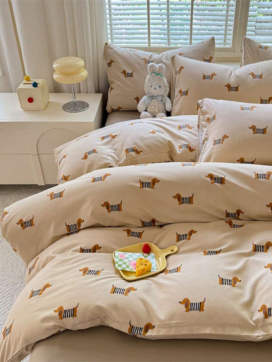 4pcs Soft Oversized Ins Style Reversible Bedding Set, Brown Dachshund Dog Print Pattern, (1pc Duvet Cover + 1pc Flat Sheet + 2pcs Pillowcases), Skin-Friendly Brushed Fabric, Anti-Slip 360° Wrap, No Optical Brighteners, Breathable, Soft, Durable, Washable, Warm, Suitable For Bedroom, Guest Room, Dorm, All Season