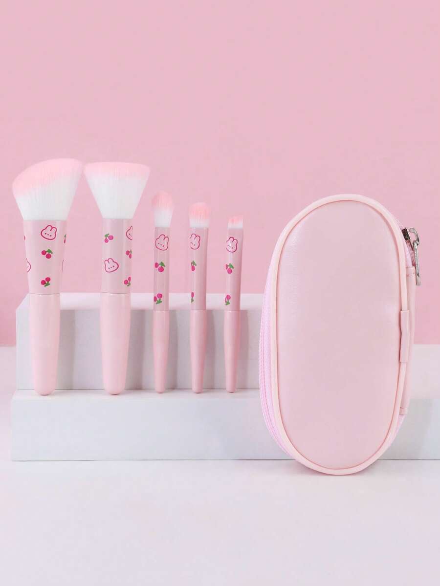 5pcs Makeup Brush Set With Pouch, Foundation, Eyeshadow, Blush Brushes With Cute Rabbit Pattern, Portable & Travel Friendly