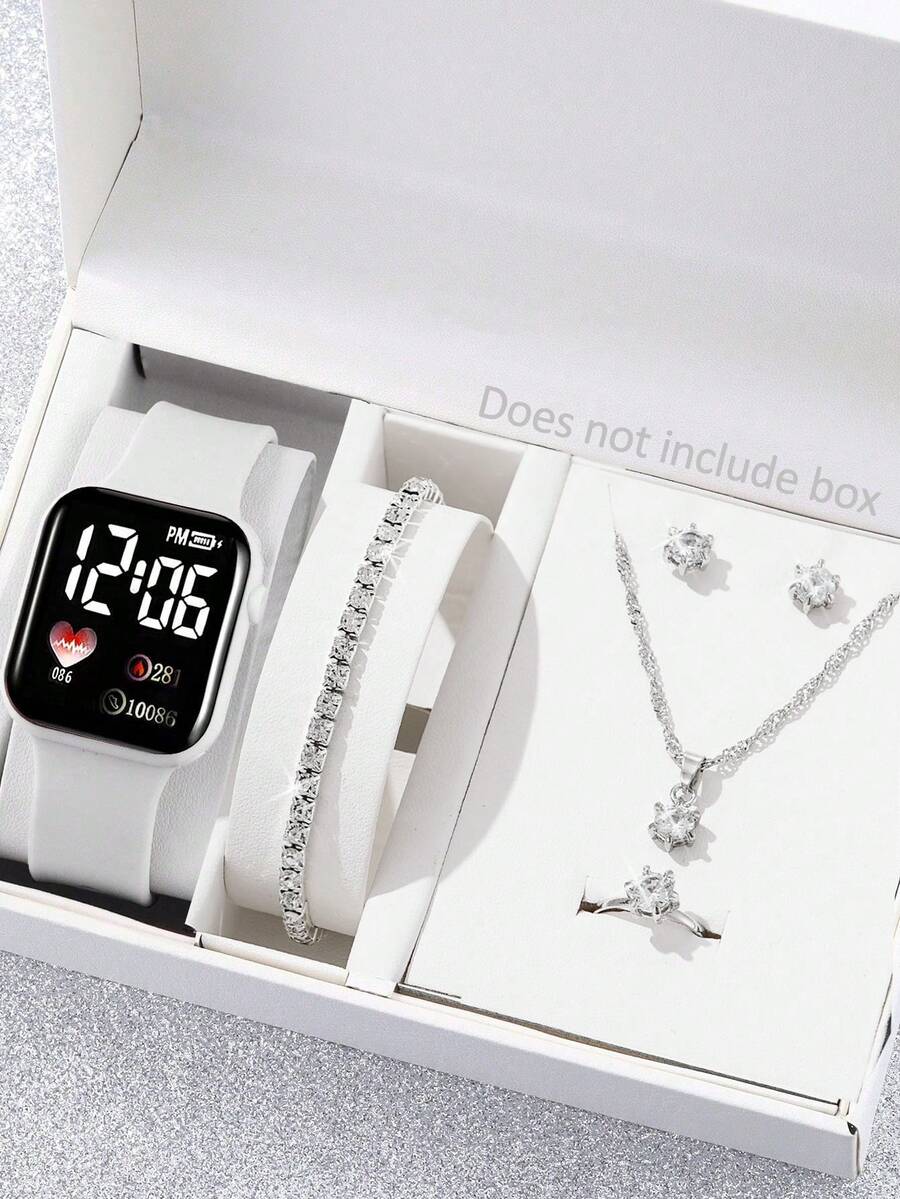 6pcs/Set Women Sports White Heart & Number Digital Watch And Elegant Crystal Romantic Jewelry Set