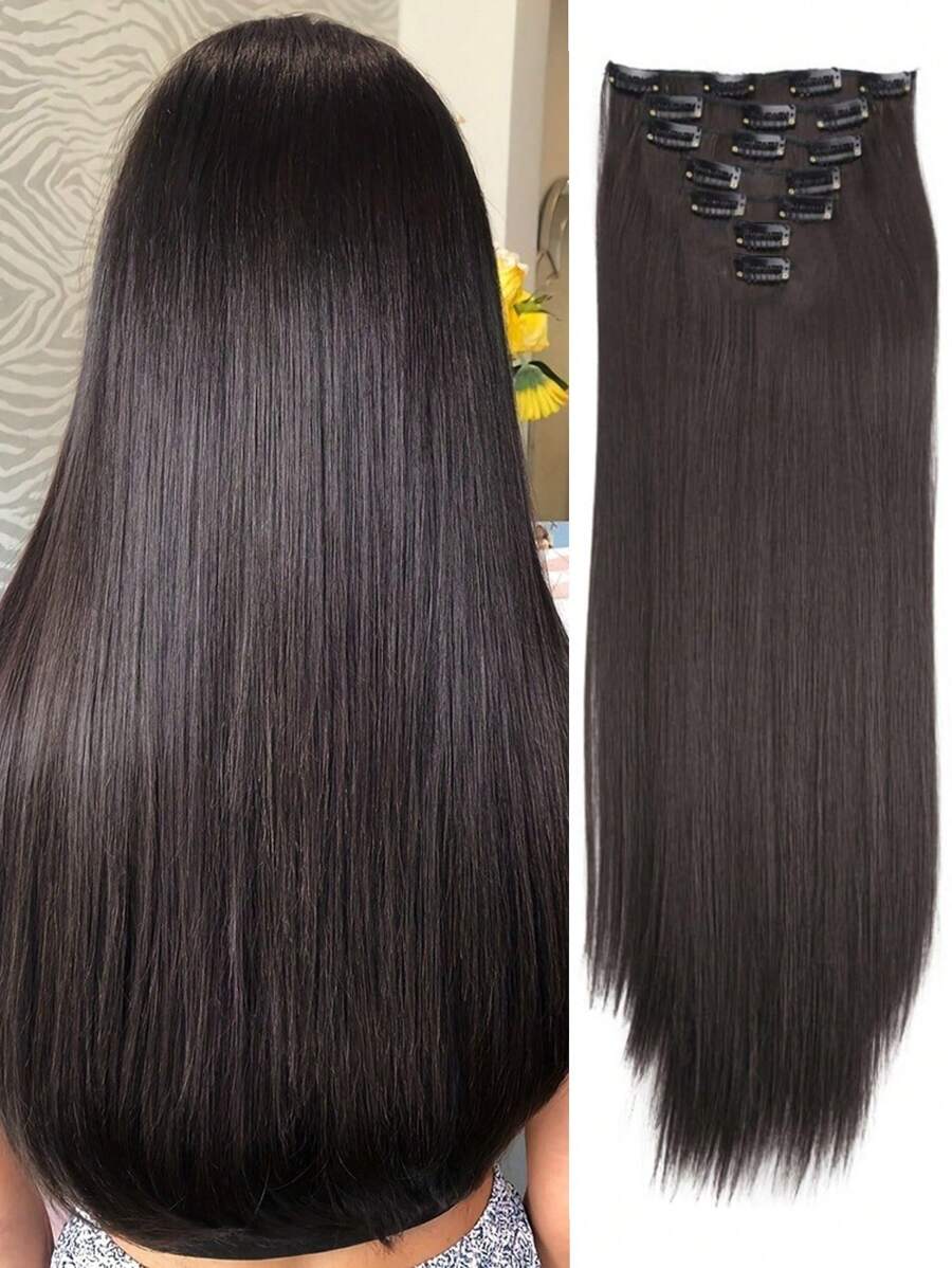 7pcs/Set 16" Clip-In Hair Extensions, Black Straight Hair, Natural Ombre, Heat Resistant Fiber, For Women