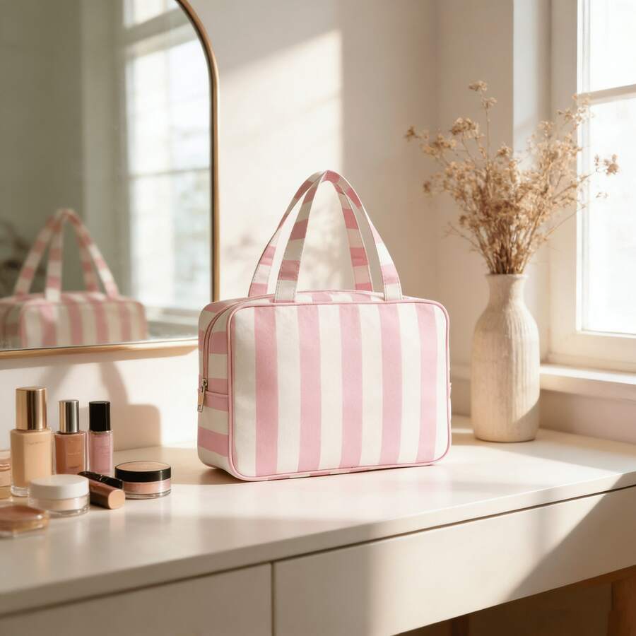 A Large Striped Cosmetic Bag, Perfect For Business Trips And Travel, With A Top Handle, Can Be Given As A Gift To Family And Friends