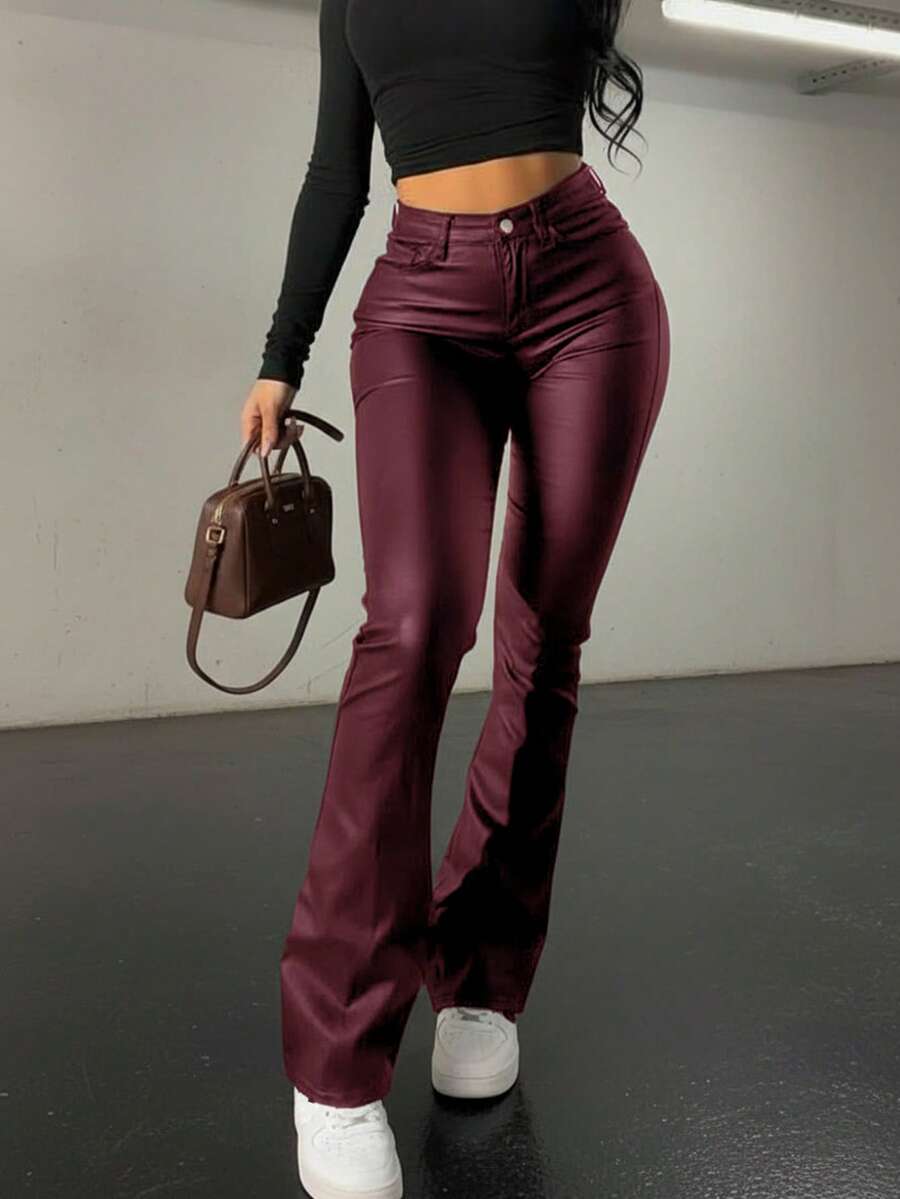 • Black High Waist Flared Coated Faux Leather Pants, Slim Fit Flattering, American Beauty Style, Spring Season - Burgundy - View 2