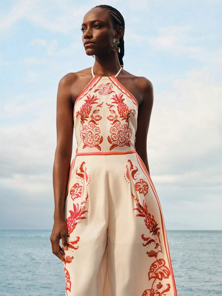 CAJUNI Women's Halter Strap Wide Leg Romper Vacation Casual Summer Boho Tropical Rhododendron, Pineapple, Turtle Back Bamboo Print Romper