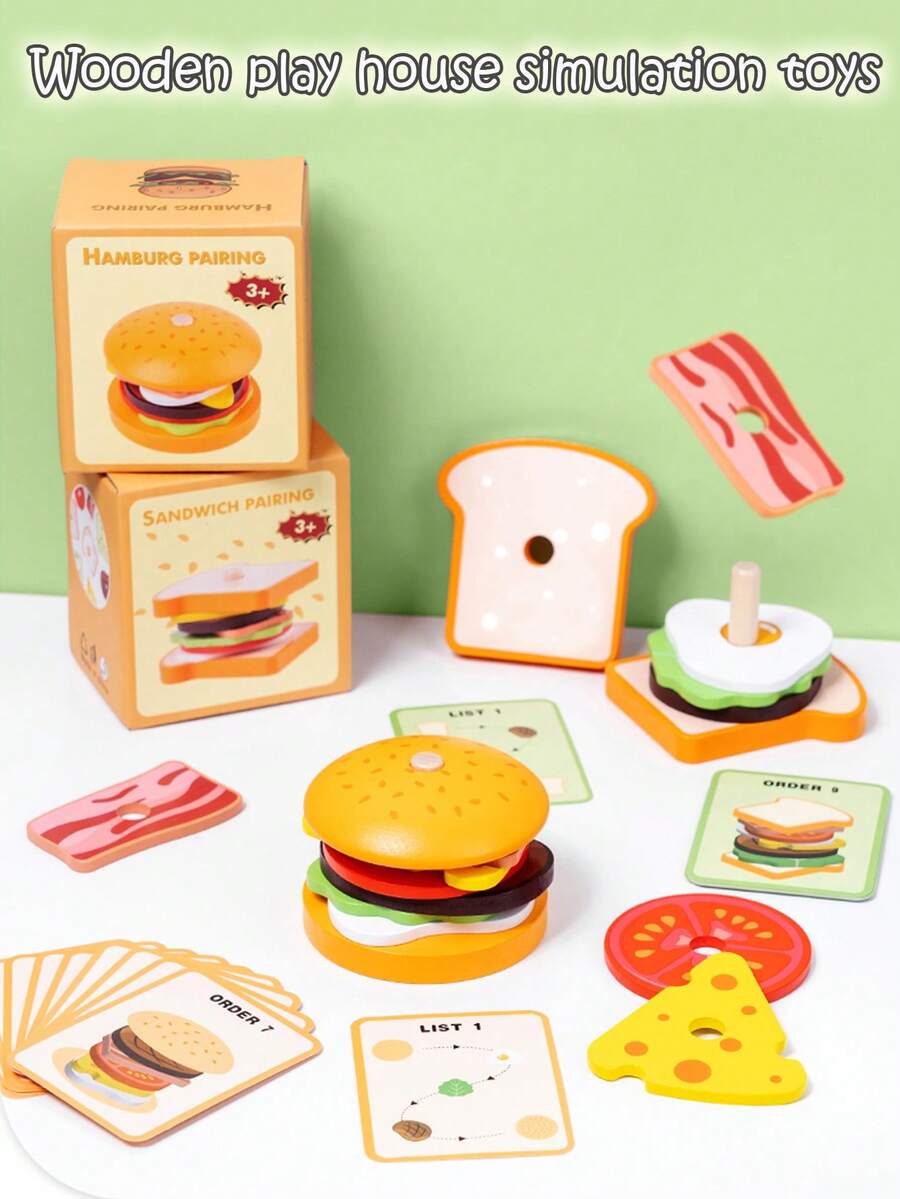 Children's Simulated Wooden Pretend Burger, Sandwich Set Column Matching, Educational Food Assembly Toys, Early Education Interactive Kitchen Pretend Toys Fun Stacking Toys That Simulate Food