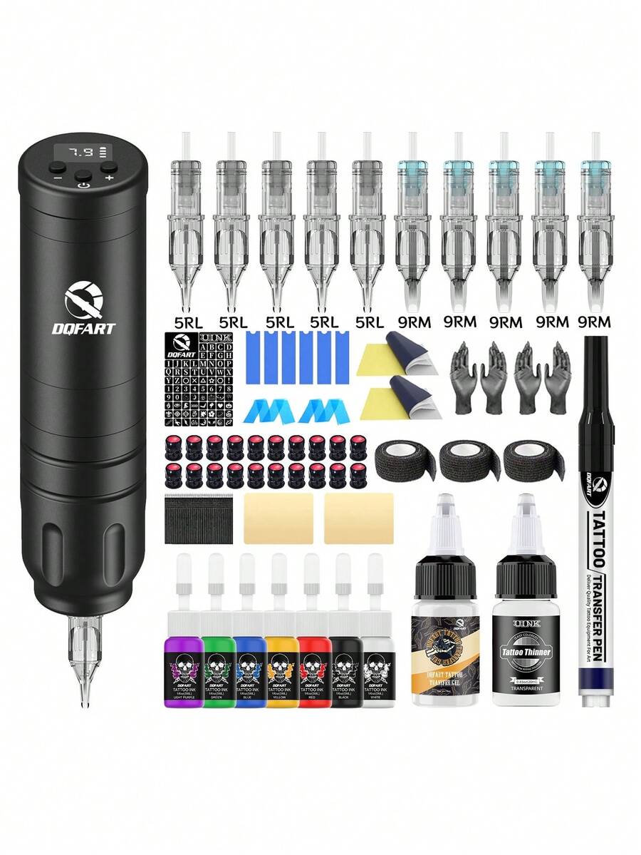 DQFART This Wireless Tattoo Gun Kit Features A 1500mAh Power Supply, Is Made Of Aluminum Alloy, And Is An All-In-One Tattoo Machine Set Suitable For Beginners And Artists. It Includes A Complete Tattoo Pen Kit With Tattoo Needles, Tattoo Ink, Tattoo Stencils, Tattoo Transfer Paper, Tattoo Transfer Paste, And Various Other Tattoo Supplies.