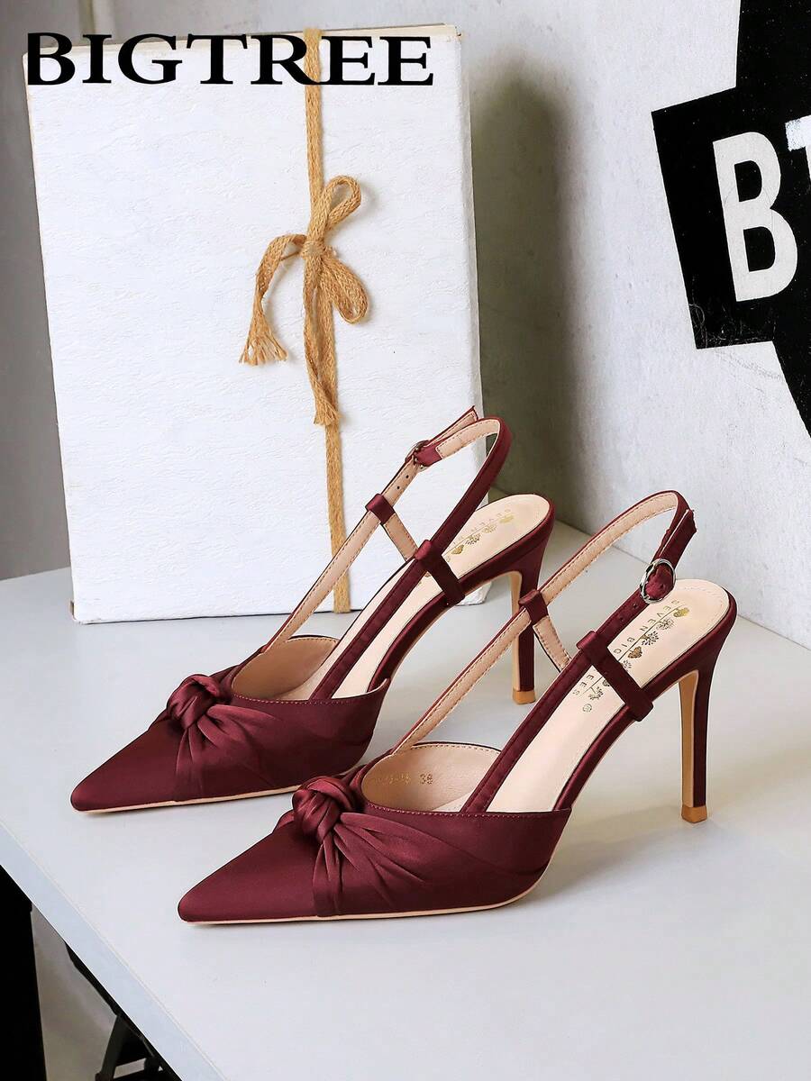 • European & American Style Satin Bow Pointed Toe Slip-On High Heel Pumps, Low Vamp Backless Women Party Shoes - Burgundy - View 7