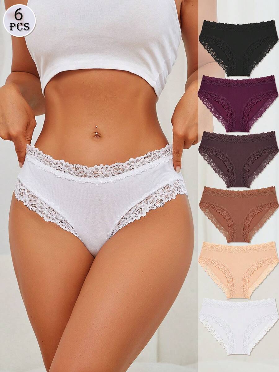 FINETOO 6pcs Ladies Romantic Floral Lace Trim Briefs, Mauve
