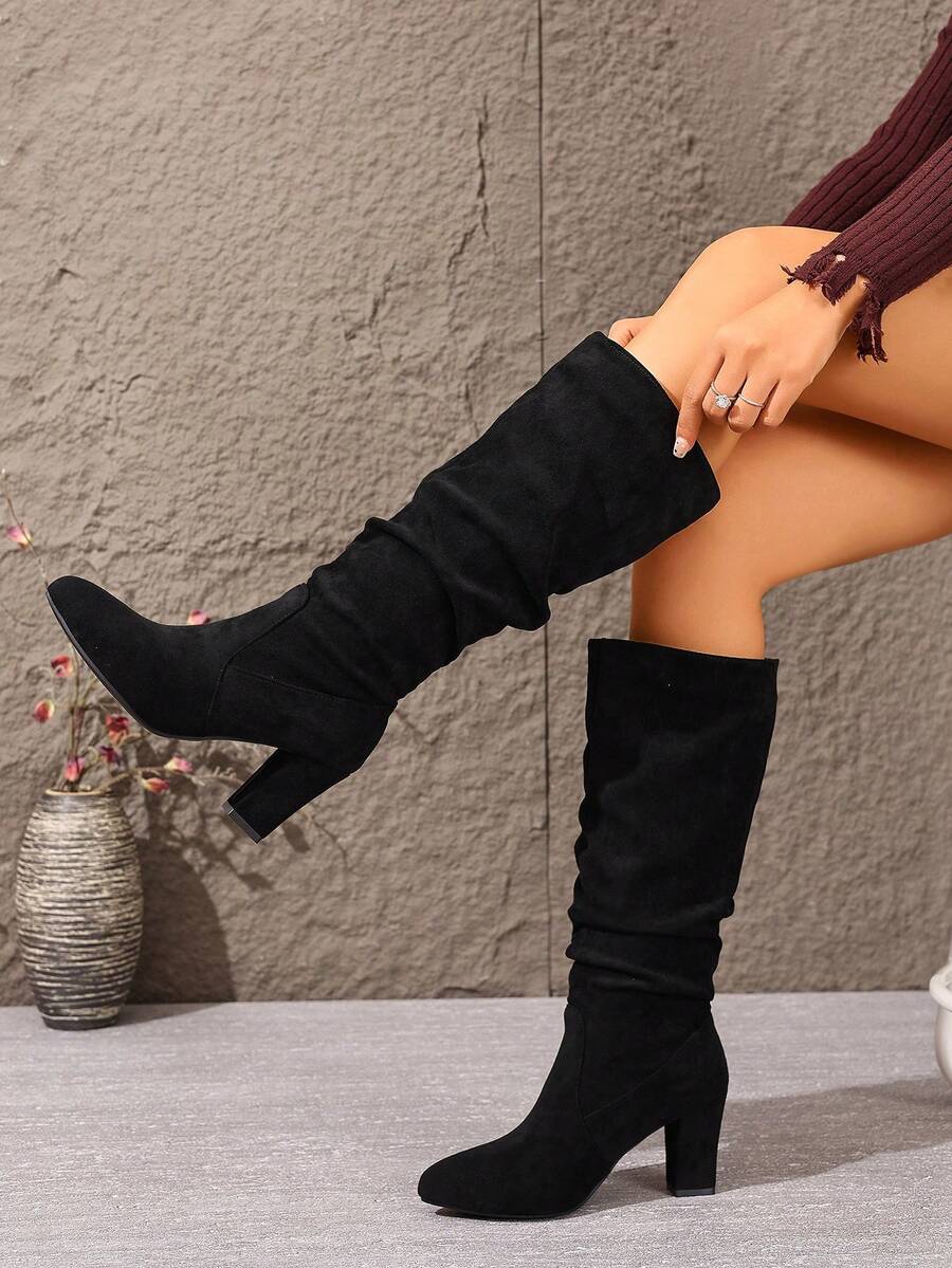 Fall/Winter Women's Over-The-Knee Boots, Wide Calf Suede Pointed Toe Chunky Heel Loose Fit Tall Boots, Versatile Black Boots Suitable For Dates, Parties, Commuting And Daily Wear