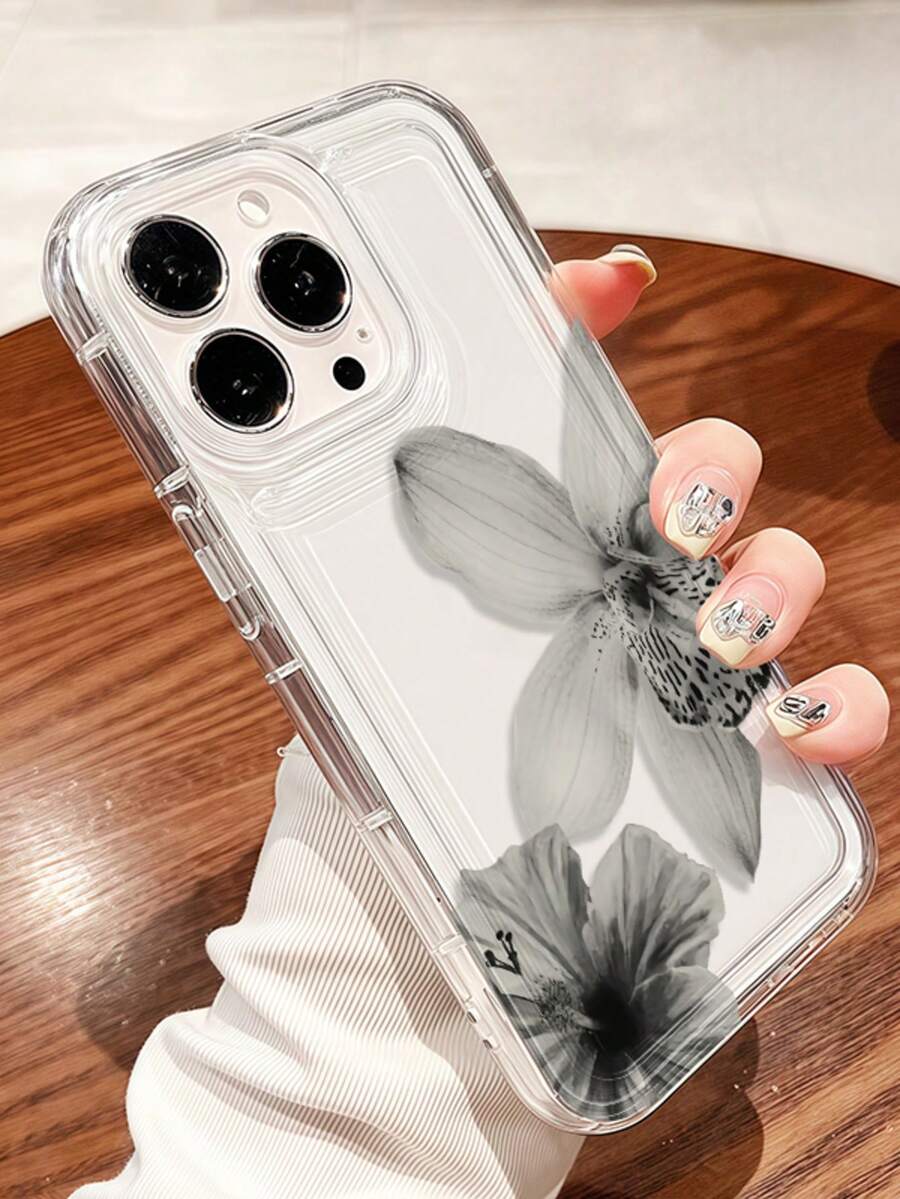 Flower 1pc Black & Gray Floral Transparent Air Cushion Minimalist TPU Shockproof Phone Case Compatible With IPhone 17/16/15/14/13/12/11 Pro Max, Galaxy A55/54/53/52/51, S25/24/23/22/21 Series