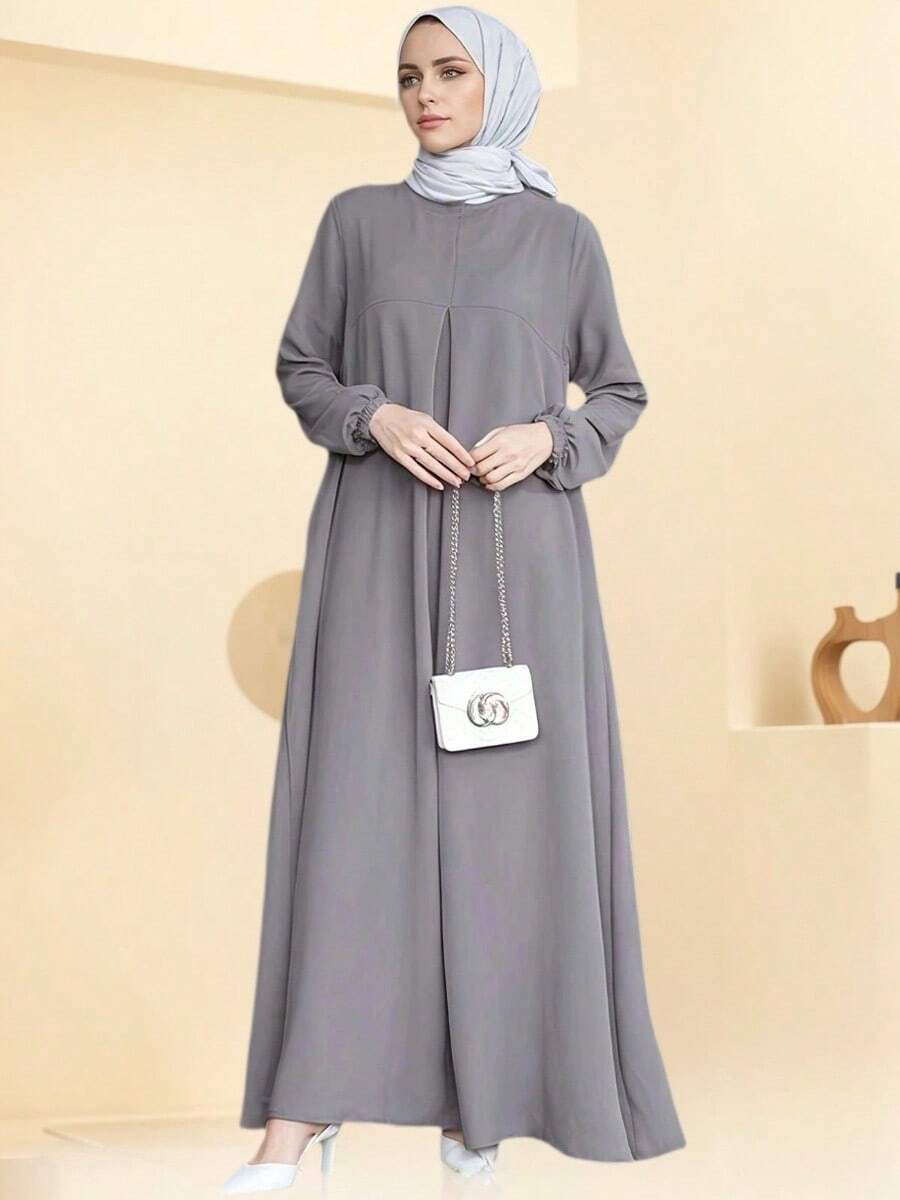 GDfashion Women's Gray Loose Long Abaya, With Ruffle Sleeve Cuffs And Pleated Details, Islamic Casual Maxi Dress