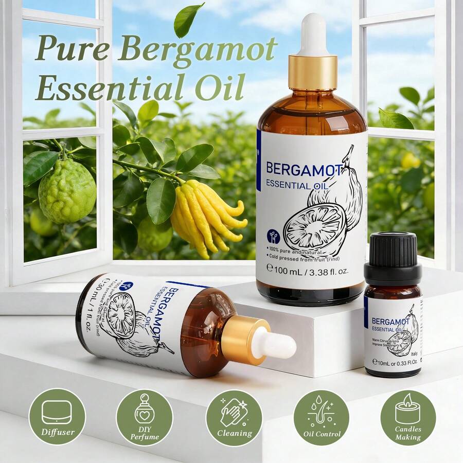 HIQILI 100mL/30mL/10mL Bergamot Essential Oil, Pure Natural Citrus Essential Oil For Cleaning, Nourishing Skin, Diffuser, Humidifier, Massage, Deep Relaxation, Stress Relief, Candles Soaps Making