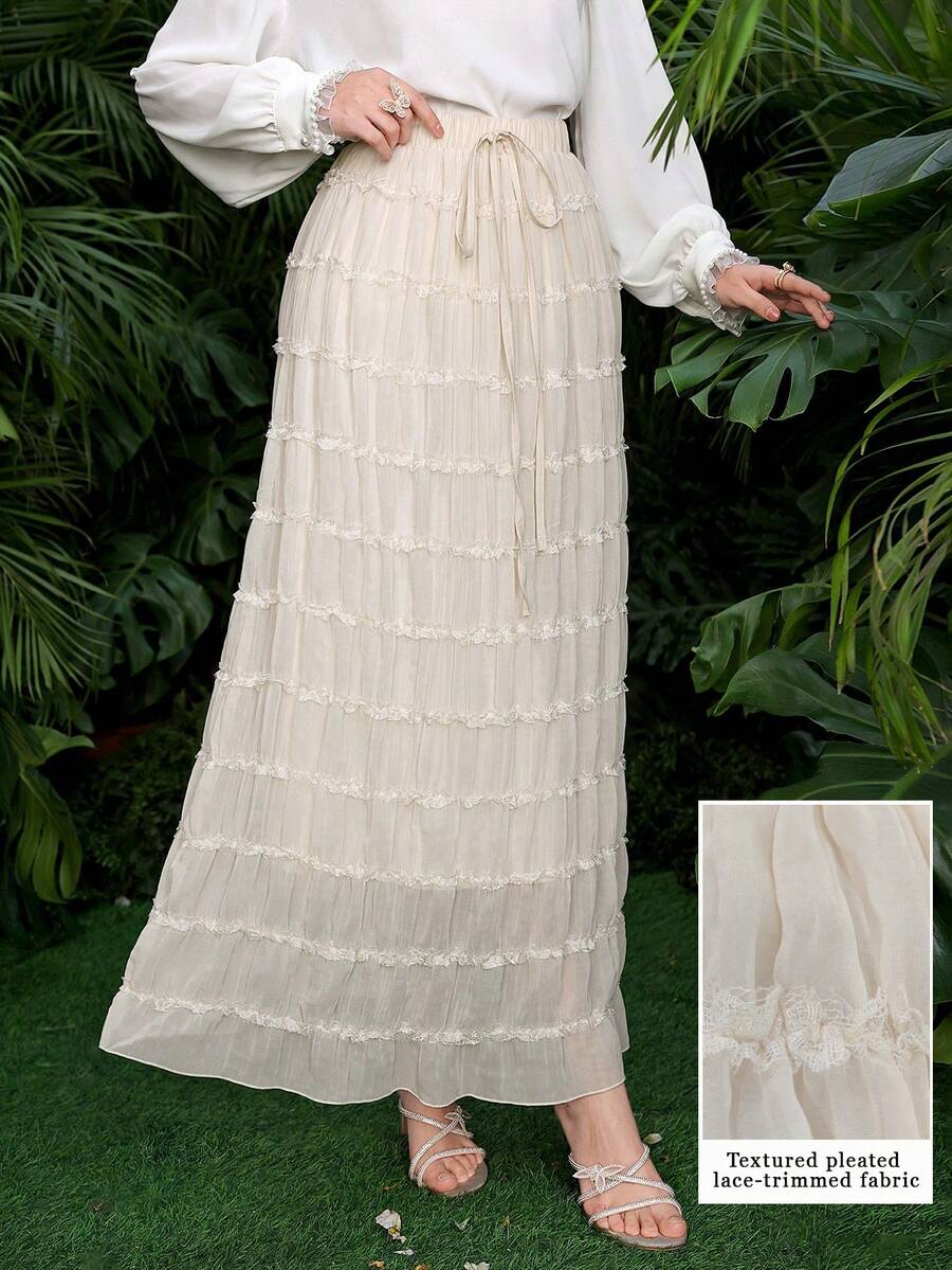 Lacomfia Women's French Style Apricot Pleated Cinched Waist A-Line Skirt