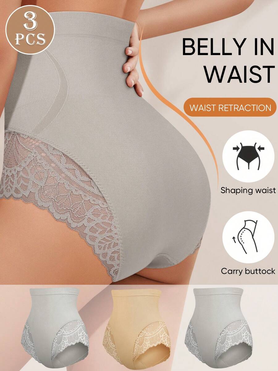 MEIYATING 3pcs High Waist Seamless Shaping Panties, Lace Pattern Underwear For Women