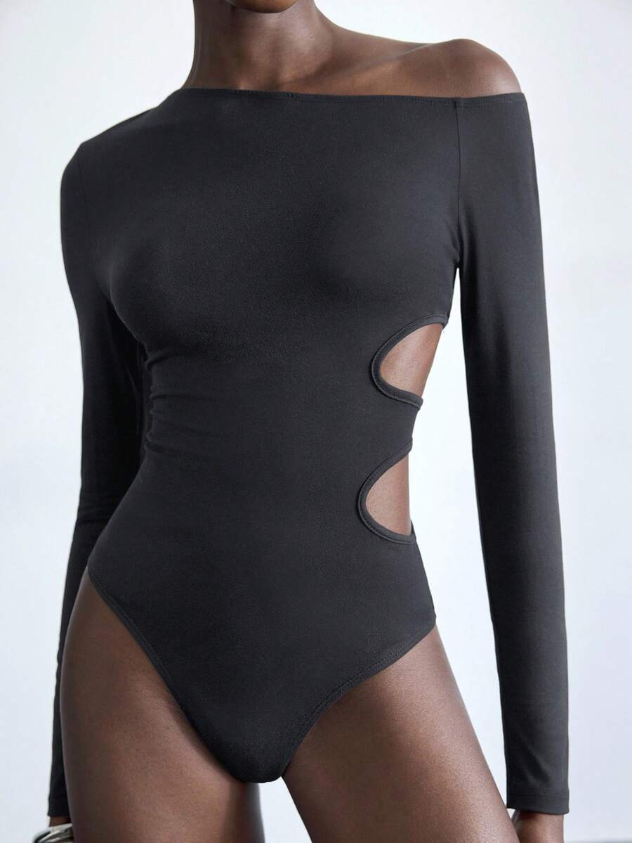 Maija Women's Black High-Stretch Fabric Attention-Grabbing Asymmetric Shoulder Design Waist Hollow-Out Bodysuit, Suitable For Urban Commute, Business, Casual, Wedding Guest, Christmas, New Year Party