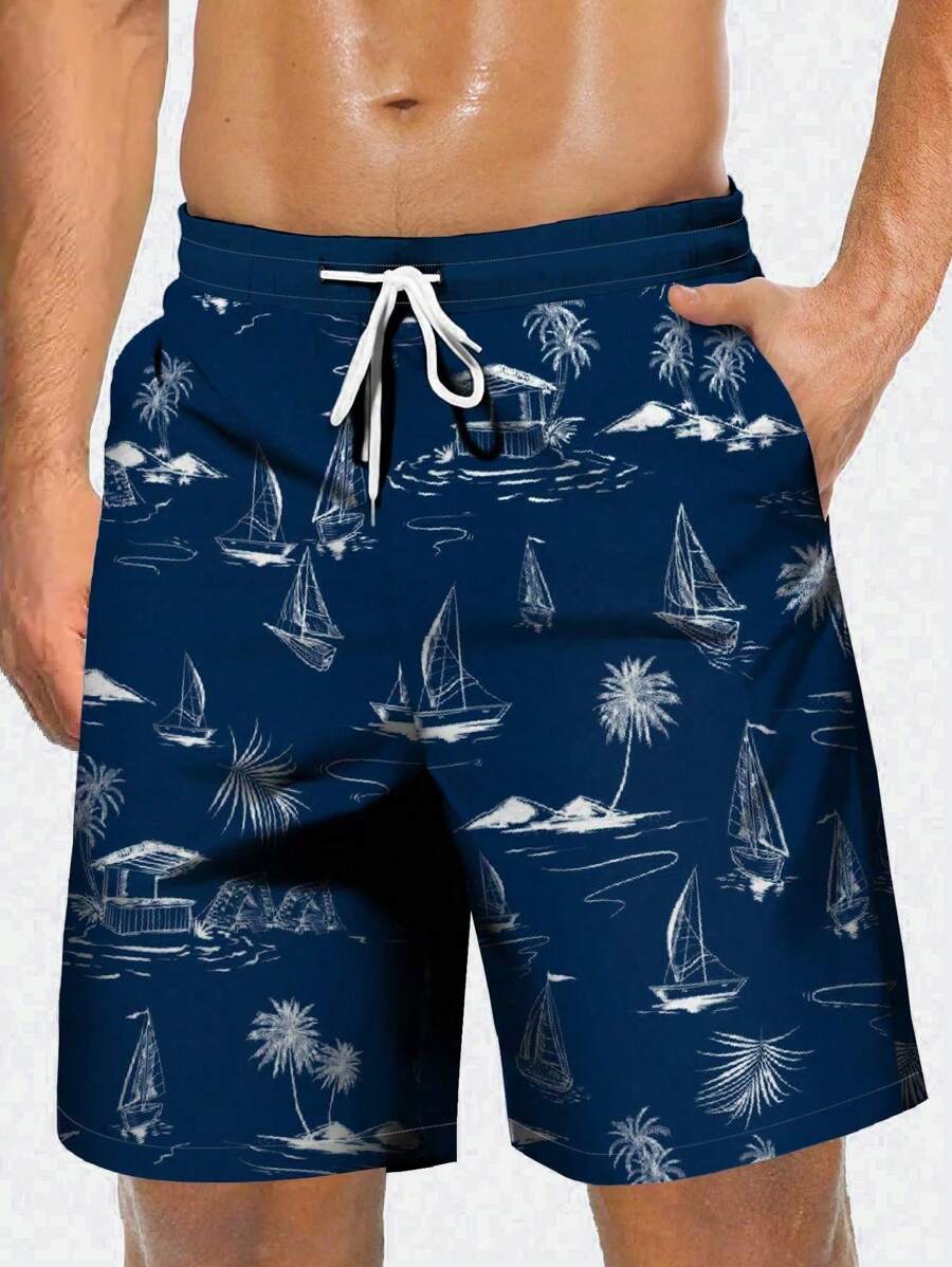 Men's Swimming Trunks With Halloween Coconut Sailboat Line Art 3D Digital Print, Casual Daily Holiday Beach Shorts With Drawstring, Single Layer No Lining