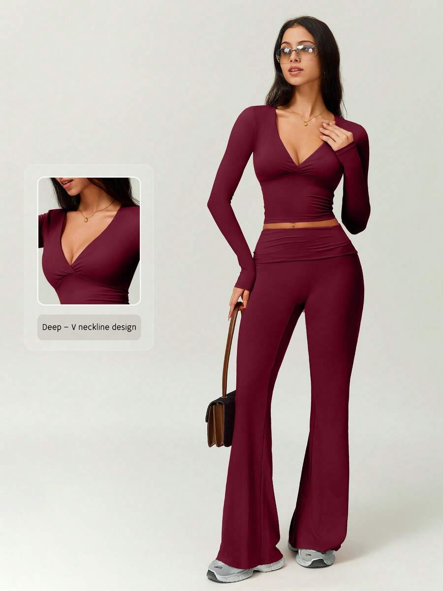 • NcmRyu 1 Set Women Seamless Comfortable Fitness Exercise Running Outdoor Christmas Long Sleeve Top And Pants Sports Suit - Burgundy - View 2