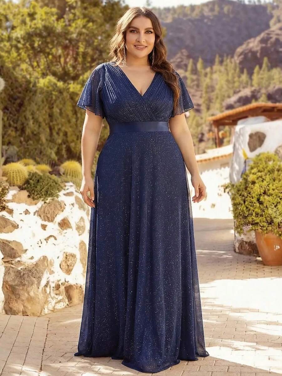 • Plus Size Women Shiny Ruched Butterfly Sleeve Navy Blue Bridesmaid Dress Elegant Spring Summer Wedding Guest Dresses For Party - Navy Blue - View 9