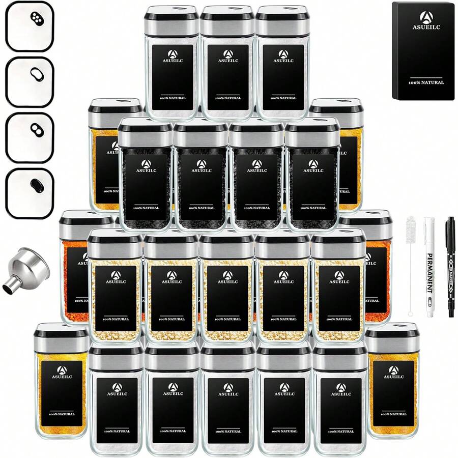 SAEIV 35 Square Spice Jars, 120ml Spice Jar Set (With Shaker Insert), Spice Shaker With Twist-Off Lid - Strong Closure, Stainless Steel Spice Storage Box (With Funnel, Label, And Pen)