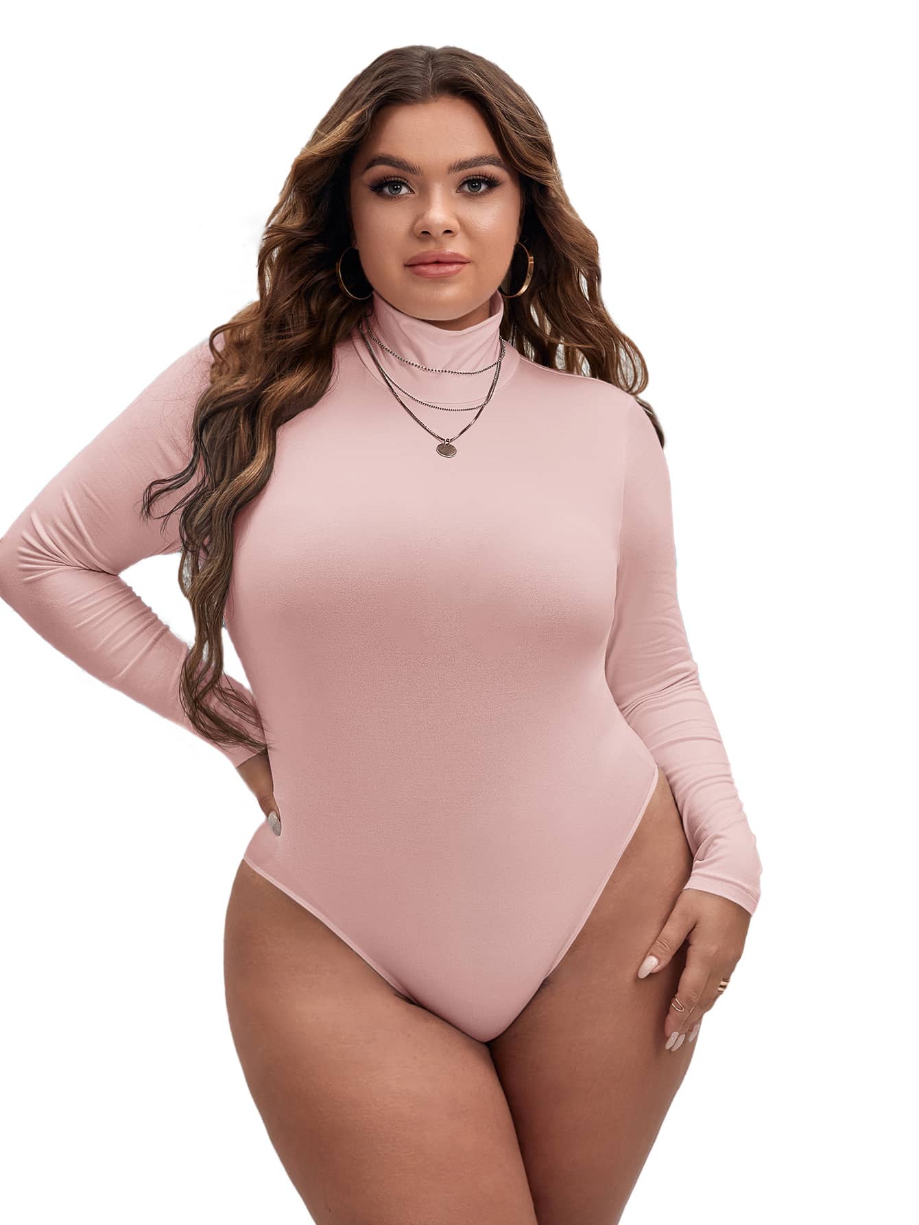 • SHEIN Essnce Plus High Neck Slim Fit Tee Bodysuit, For Spring To Summer - Baby Pink - View 3