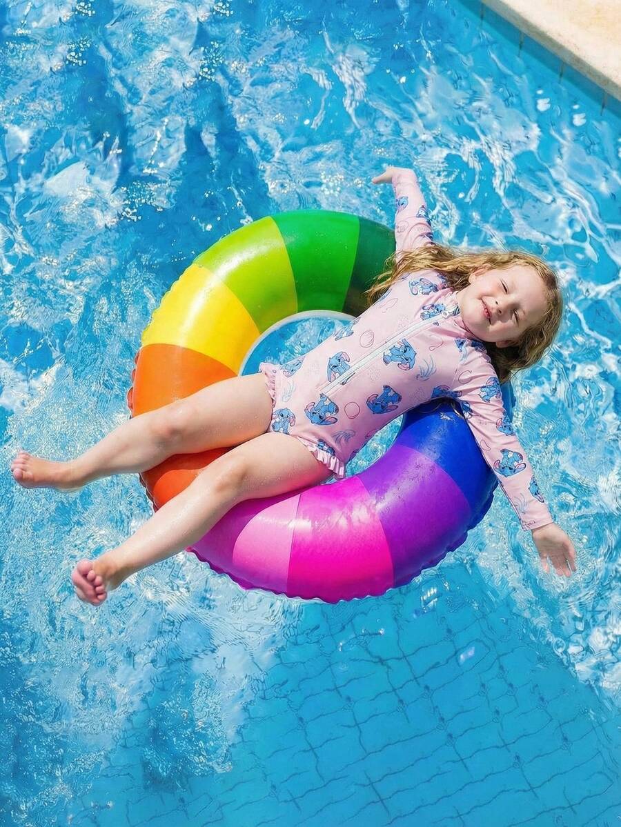 SHEIN Girls' Blue Cute Cartoon Print Long Sleeve One-Piece Swimsuit Set (With Hat), Girls' Swimsuit Set, Girls' Beach Outfit, Girls' Long Sleeve Rash Guard Beach Set Suitable For Vacation, Summer Zipper Round Neck Swimsuit