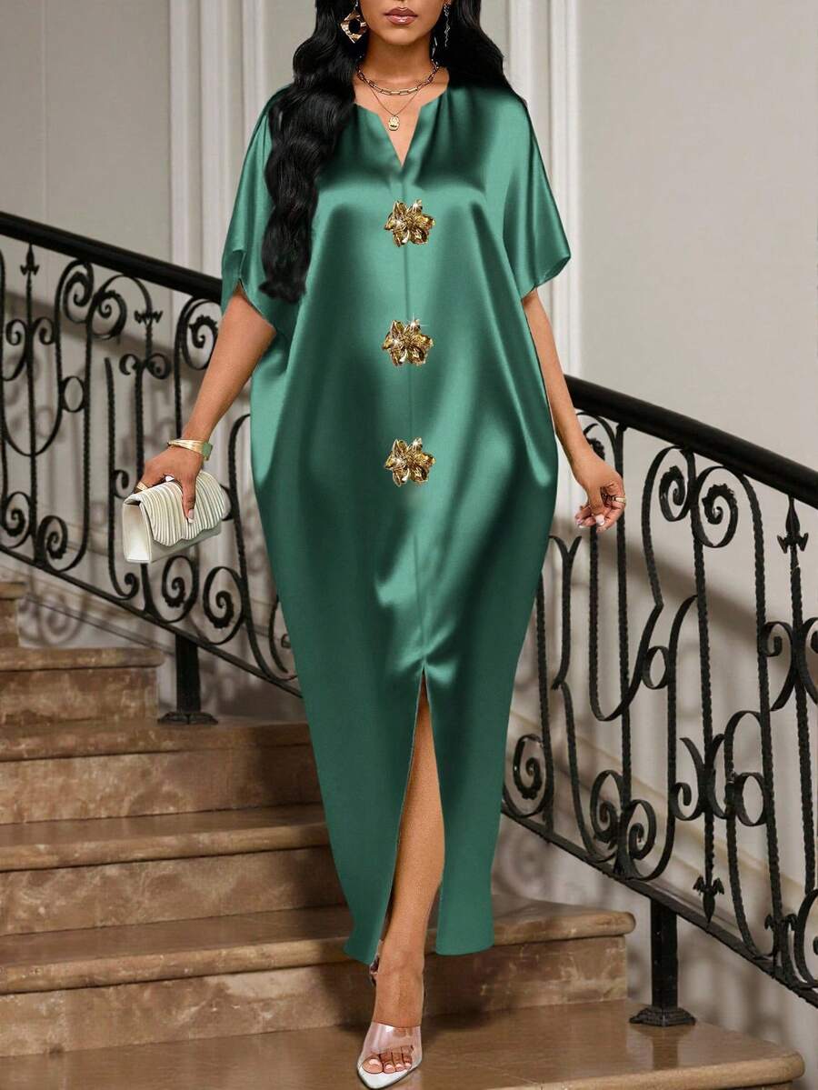 SHEIN Lady Holiday Dresses Four Season/Wedding Guest/ Attire/Prom Dress/Gold /Dinner Outfit/Gold Women's Satin Jacquard Front Slit Dress, Casual Party Elegant,Dresses For Women Elegant