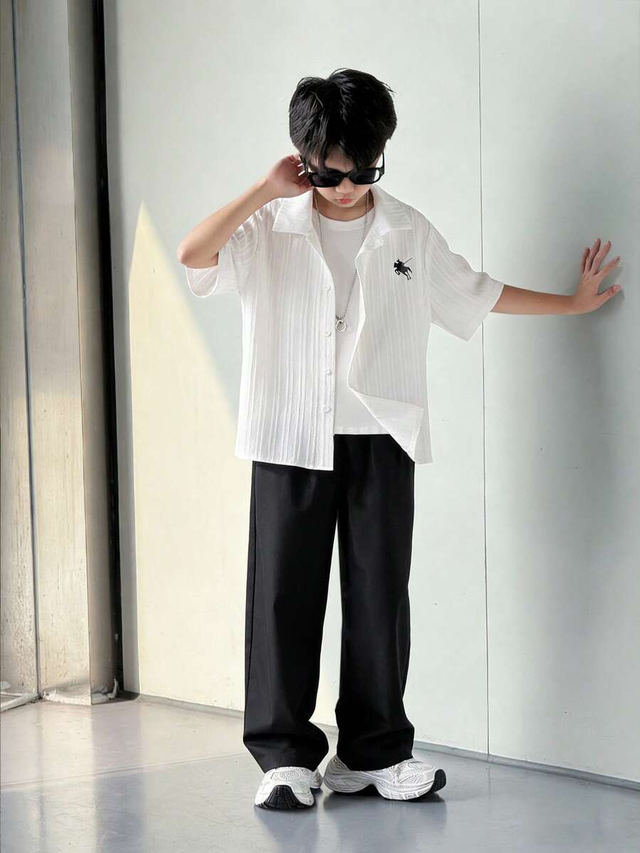 SHEIN Mirajuku 2pcs/Set Casual Teenager White Shirt And Pants Suit, Versatile And Minimalist Style For Tween Boys