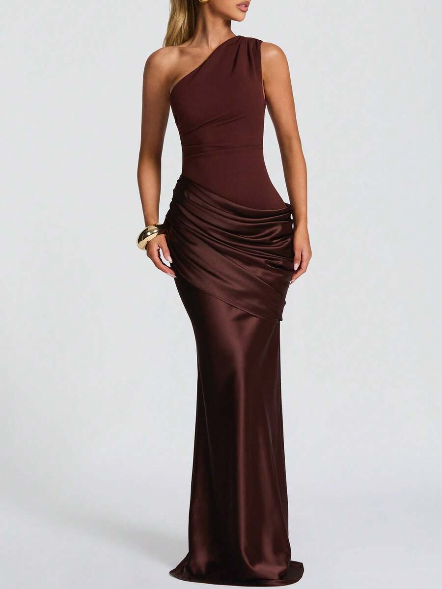 Sadona Women's Sexy One-Shoulder Bodycon Dress, Summer Draped Long Dress, Brown, Elegant For Birthday Party, Cocktail Gown
